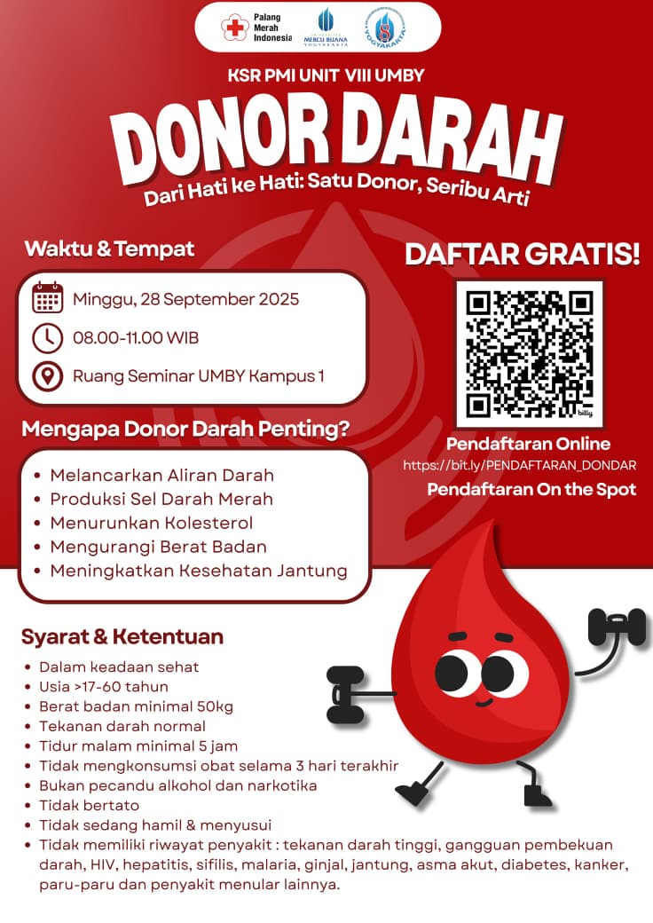 KSR PMI Unit VIII Universitas Mercu Buana Yogyakarta (UMBY) kembali menggelar kegiatan donor darah yang penuh semangat pada Minggu, 28 September 2025, pukul 08.00 –11.00 WIB di Ruang Seminar Kampus 1 UMBY. Mengusung tema “Dari Hati ke Hati : Satu Donor, Seribu Arti”, acara ini mengajak semua orang untuk berbagi kebaikan dan menyelamatkan nyawa dengan cara yang sederhana namun berarti.